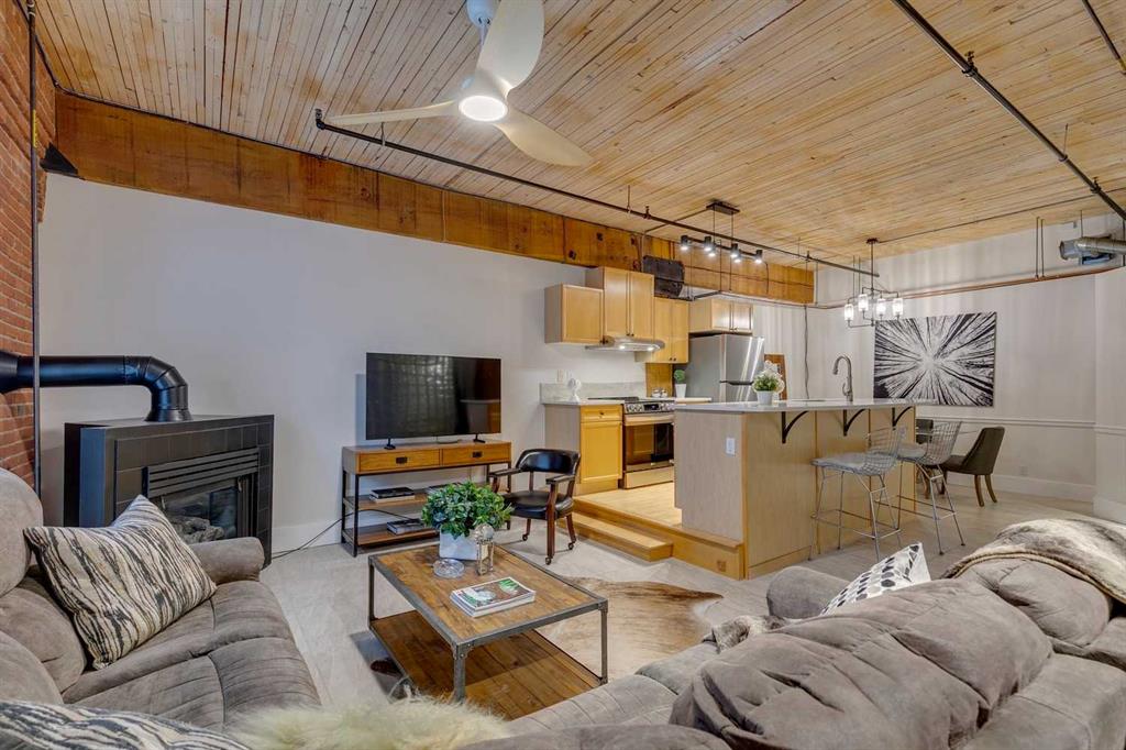 "THE HUDSON" a masterpiece loft, and piece of The Hudson Bay company historic building warehouse converted to loft with soaring 10.6 ft ceilings, for an immediate sense of space. Live, work, relax in this quiet updated, character unit. Brand New energy star LG APPLIANCES, FRESHLY PAINTED , & UPDATED FIREPLACE. New window coverings, heated flooring throughout, MURPHY BED & QUEEN, for the convenience of an additional bed. Large, underground HEATED -TITLED parking. Walk 1 BLOCK NORTH, under the bridge is EIGHTH AVENUE PLACE - accessing all your downtown clients. Through Calgary's +15 walkway you are immediately connected to CORE SHOPPING, MEDICAL, DENTAL, & all AMMENITIES. Steps away from "THE HUDSON" lies luxury hotels & lounges, trendy restaurants; be it upscale LUCA & FLEETWOOD , or more casual outings down the street to RODNEY'S OYSTER BAR, THAI SAIGON, CRAFT 'ROOFTOP PATIO or go BOWLING AT NATIONAL. Let's not forget your quick access to SKA Thermal Spa- hydrotherapy & massage around the corner on 11th. THIS IS A GEM, IN A QUIET, CLEAN, WELL RAN BUILDING. SET UP YOUR PRIVATE SHOWING TODAY!